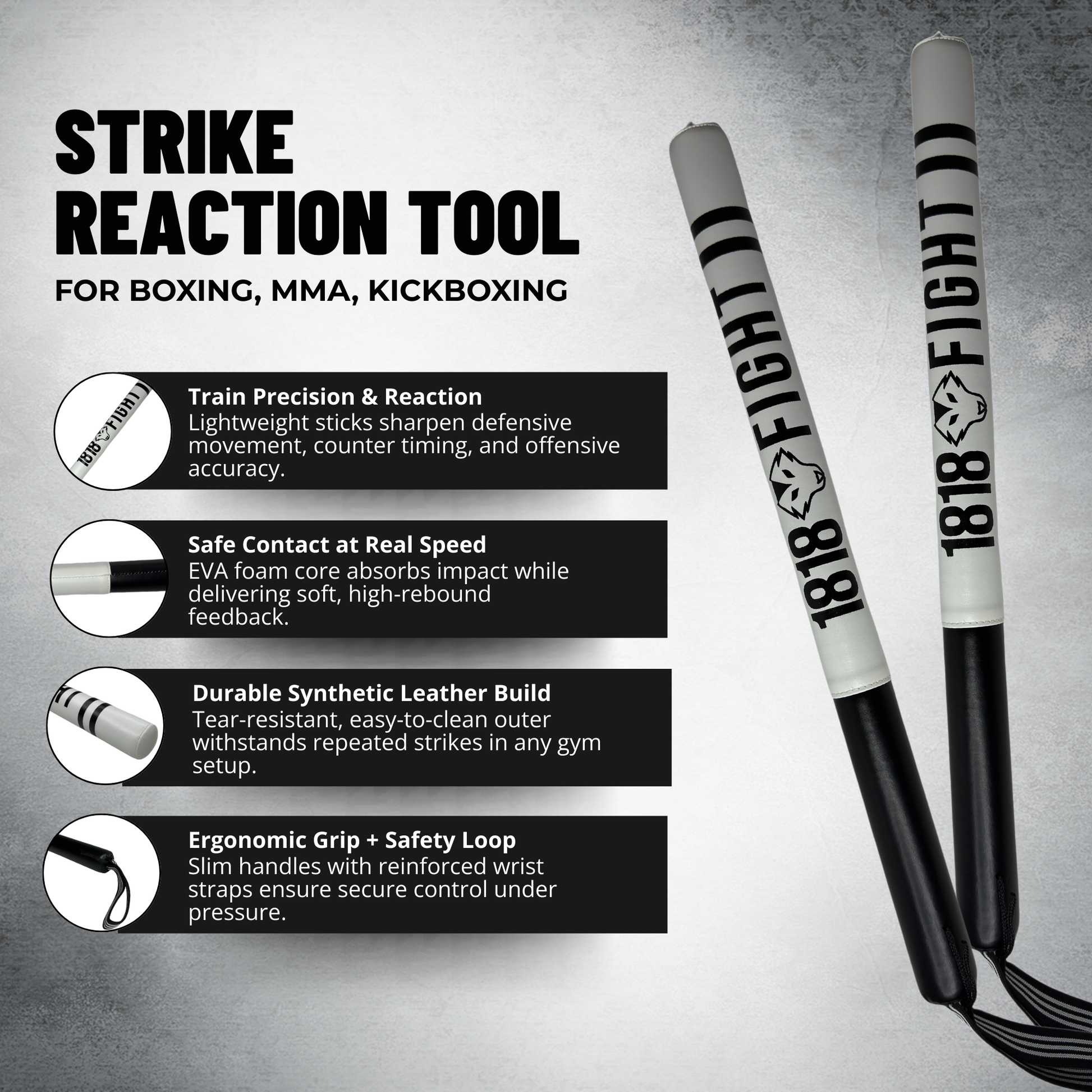 Introducing the Reflex Strike Sticks by 1818 Fight: premium lightweight training tools crafted to elevate speed, accuracy, and reactive timing across boxing, MMA, and a wide range of performance sports. Whether you’re fine-tuning your defence or building crisp offensive combinations, these sticks offer a safe, effective way to simulate real contact and sharpen critical fight skills.